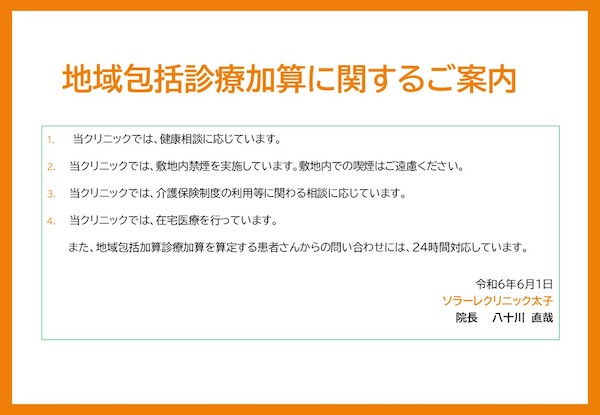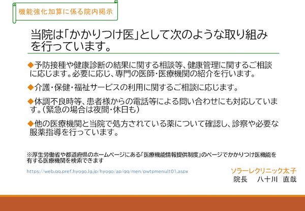 上記の加算に関して、院内にも掲示をしております。 ご不明な点等ございましたら、お気軽にお申し付けください。
